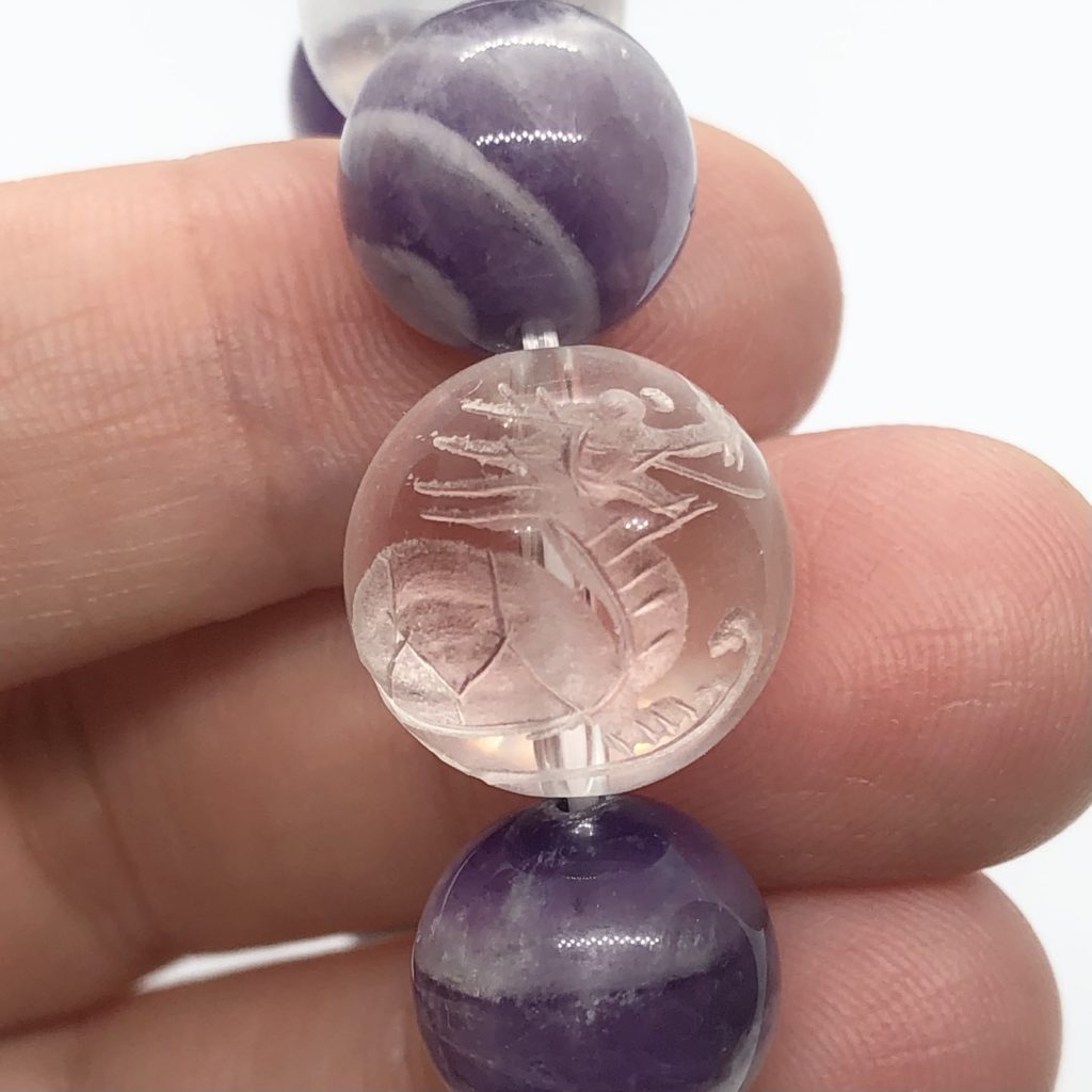 こちらのブレスレットにはそんな龍亀を手彫りで入れた水晶を配しておりますので、